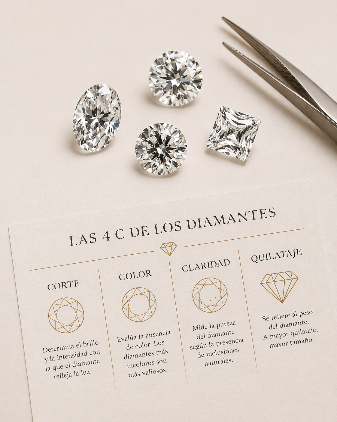 Aprende cómo el corte, color, claridad y quilataje influyen en la apariencia y calidad de un diamante.